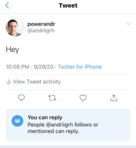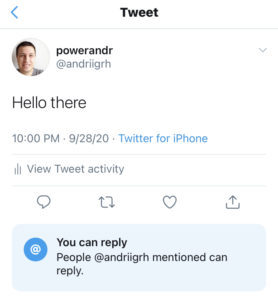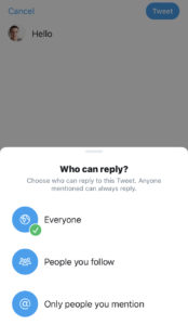 5. After you tweet, you will see a blue box below the tweet. “People you mentioned can reply”. Nobody will be able to reply, if there is no mention of someone.